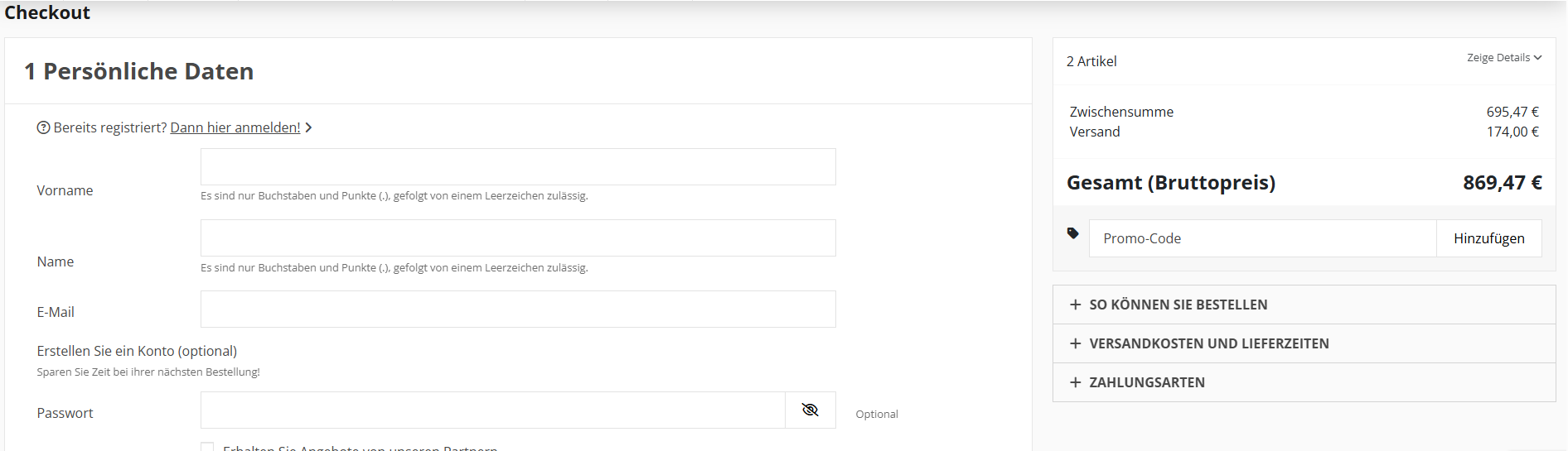 - Informazioni personali : inserisci il tuo nome, cognome e indirizzo email. Puoi creare un account per acquisti futuri o continuare come ospite dopo aver accettato l'informativa sulla privacy.
