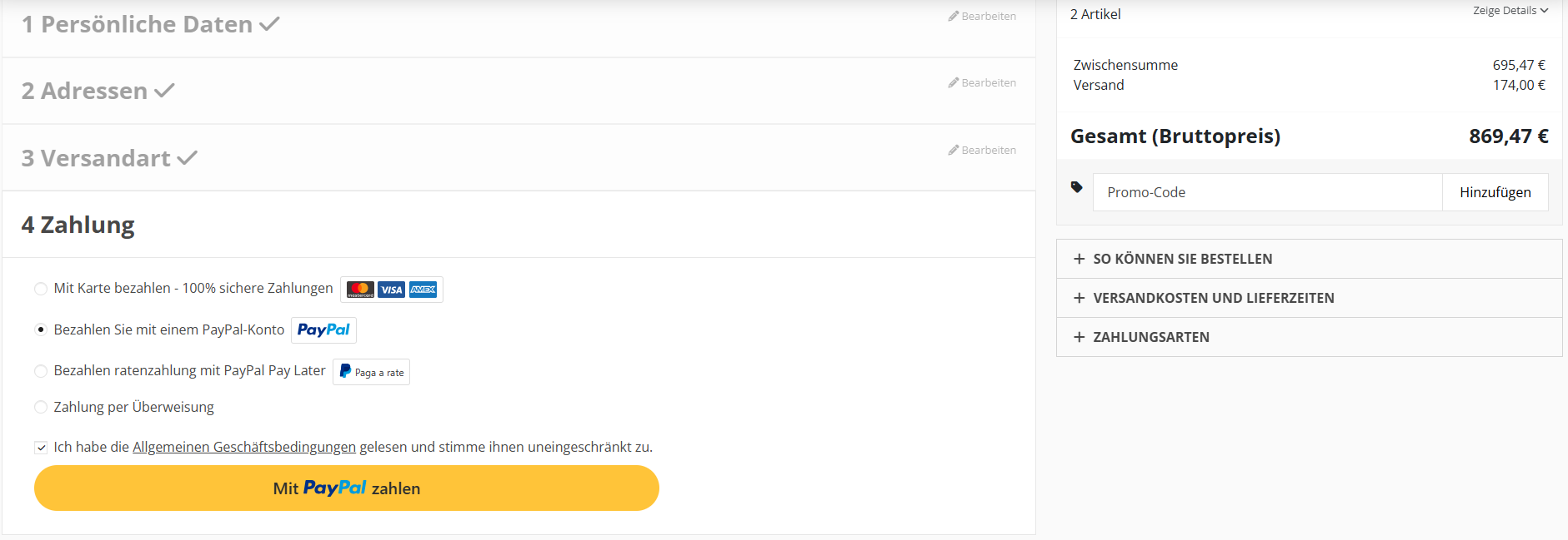 - Pagamento : Seleziona il metodo di pagamento che preferisci (bonifico bancario, contrassegno, PayPal, PayPal in 3 rate, carta di credito). Accetta l'informativa sulla privacy e procedi.