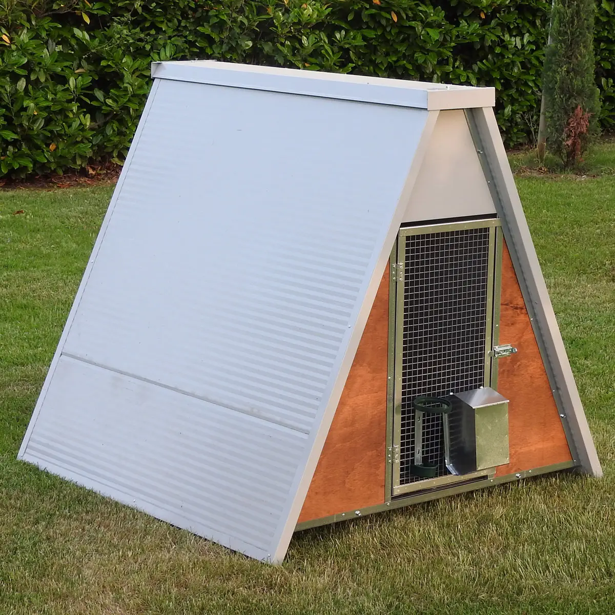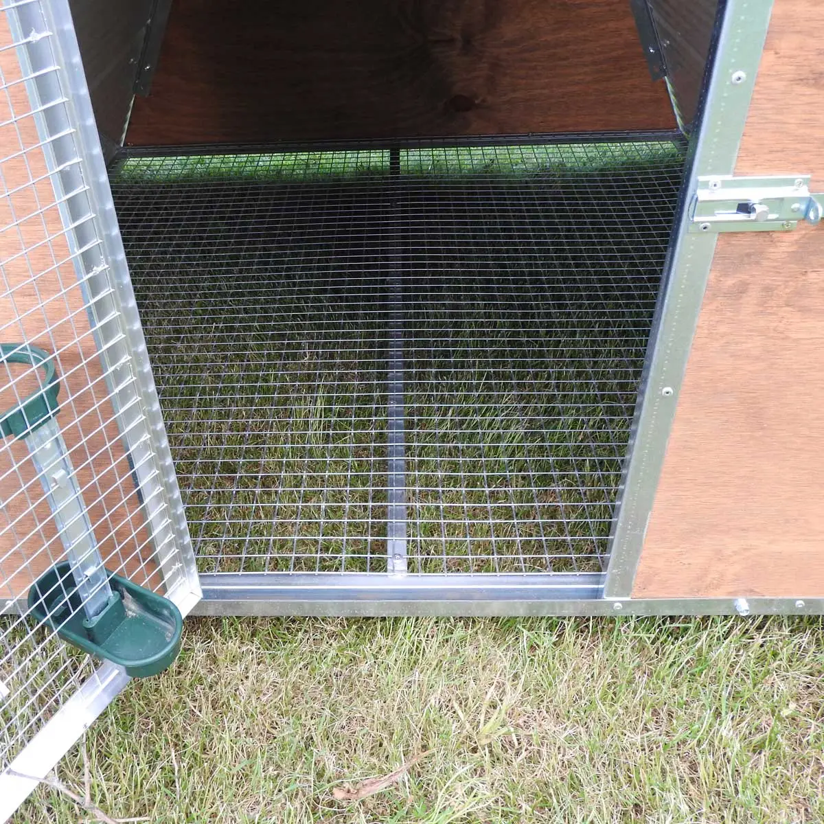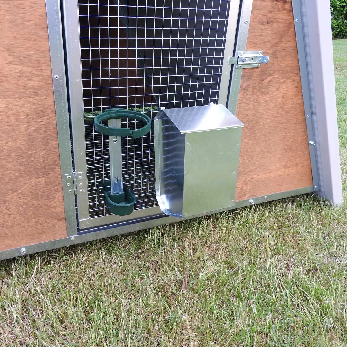 - Der Hühnerstall ist bereits komplett mit einer Futterkrippe und einer Tränke mit Flaschenhalter ausgestattet.