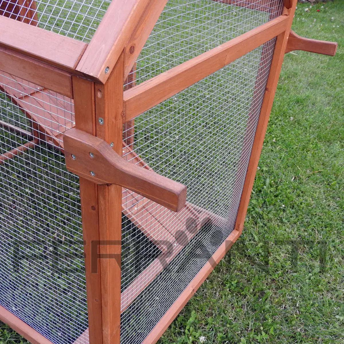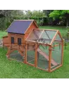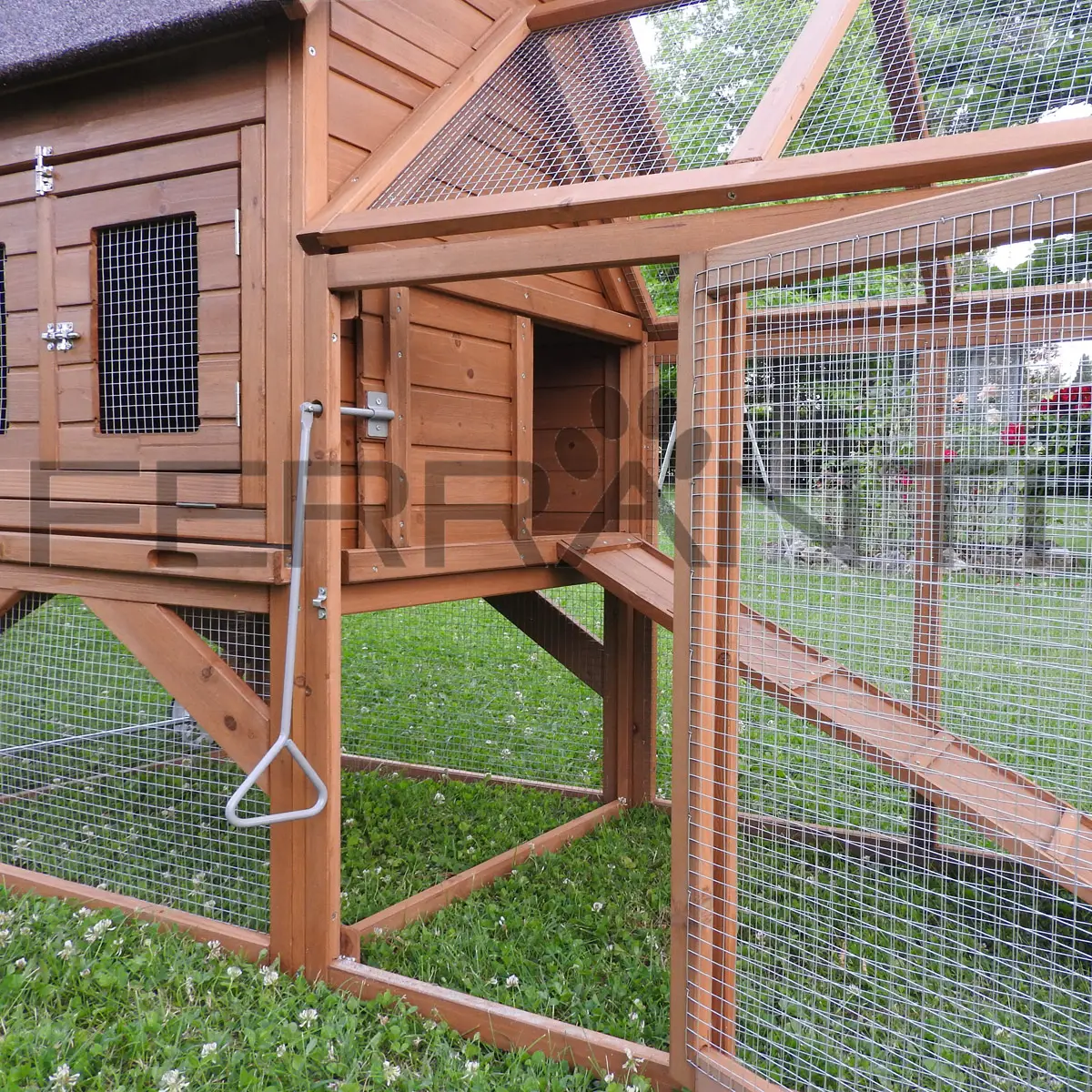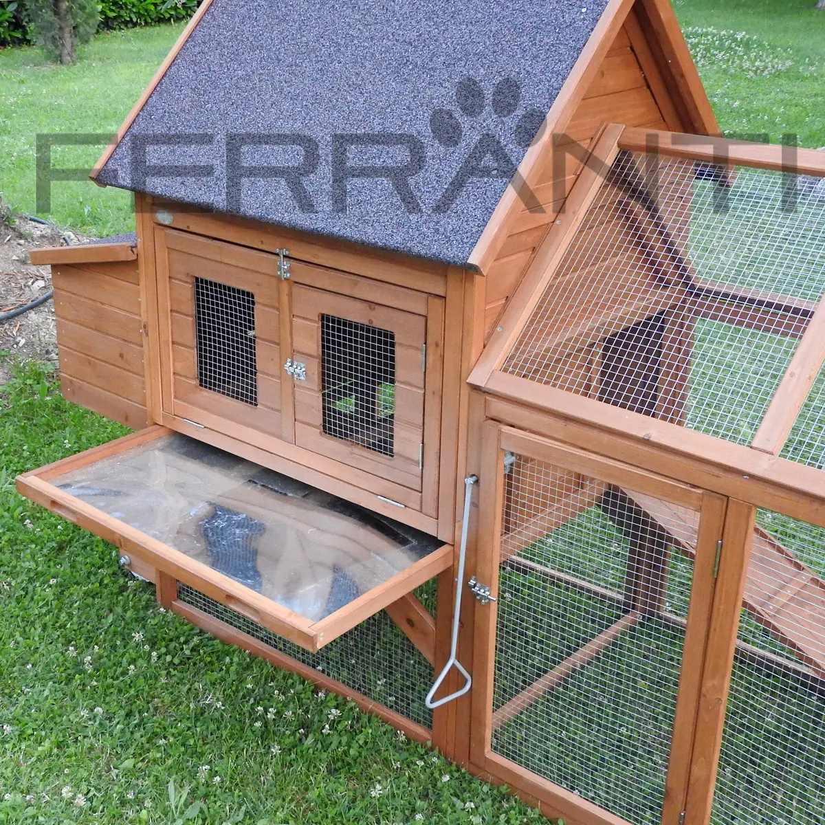 - Ein bituminiertes, wetterfestes Dach, das den Stall und das Nest vor Witterungseinflüssen schützt - Der Außenbereich ist aus sehr stabilem, elektrogeschweißtem Gitter (Maschenweite: 13 x 13 mm; Drahtstärke 0,6 mm) und imprägniertem Holz gefertigt. Neben dem offenen, vorderen Teil gibt es unter dem Schlafbereich einen überdachten Teil, welcher den Tieren auch außerhalb des Schlafbereichs Schutz vor der Witterung bietet.