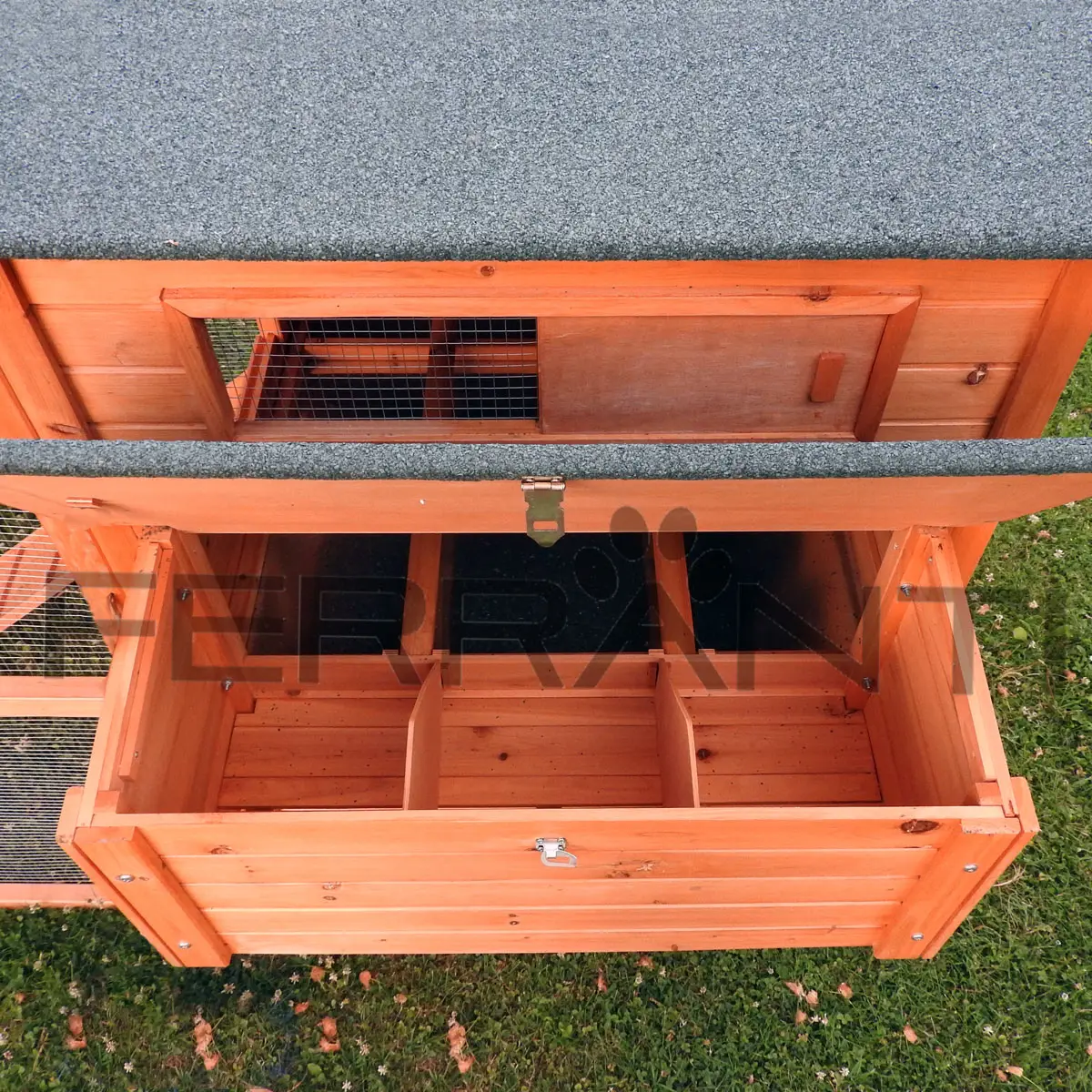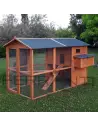 - Die Hütte (Schlafbereich) ist mit einem Dreifachnest für die Eiablage ausgestattet und verfügt über einen verschließbaren Deckel der von außen für eine bequeme Eientnahme aufgeklappt werden kann.