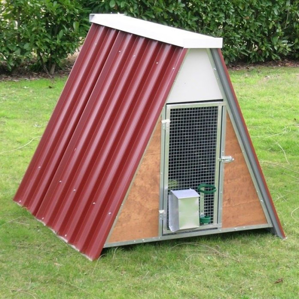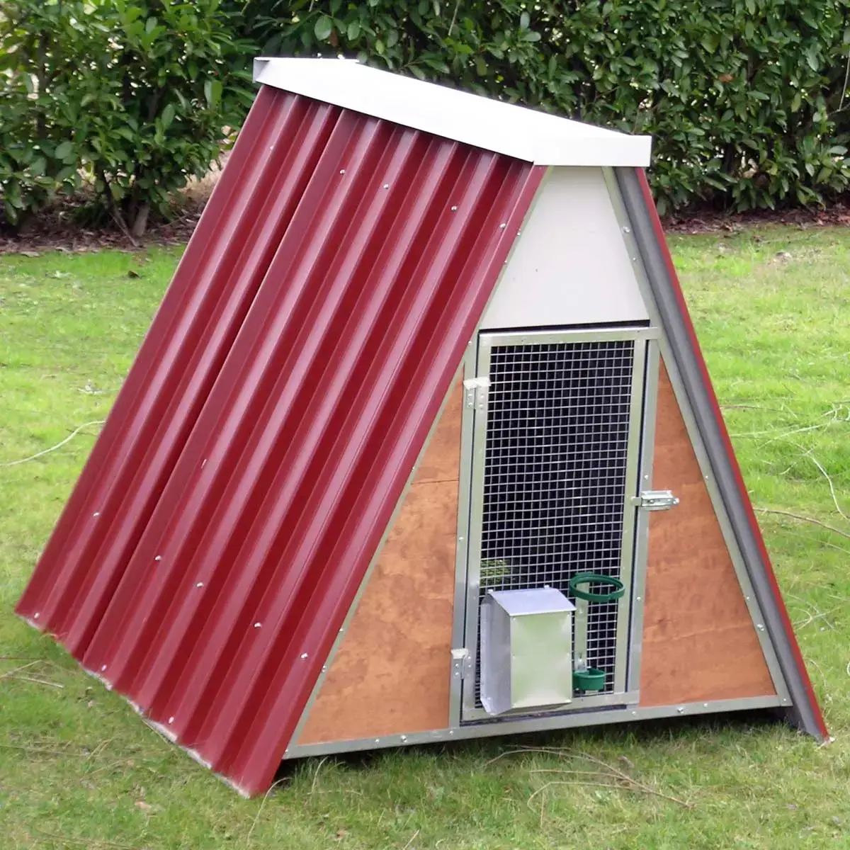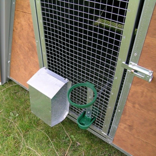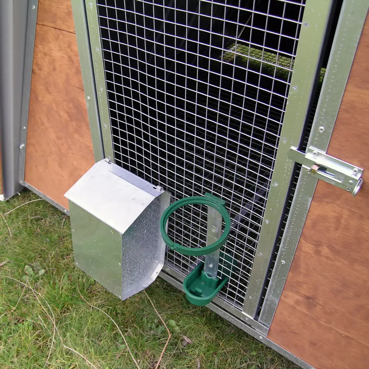 - Der Hühnerstall ist bereits komplett mit einer Futterkrippe und einer Tränke mit Flaschenhalter ausgestattet.