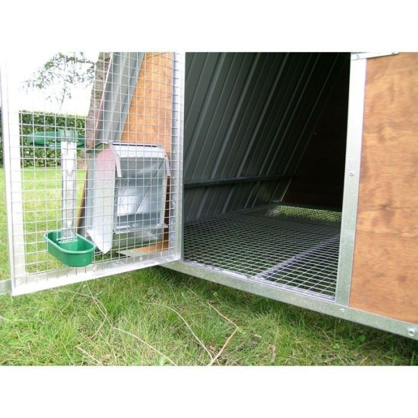 - Um den Tieren auch im Außenbereich eine vor Fressfeinden geschützte Umgebung zum picken und scharren zu bieten, kann ein passendes Freilaufgehege angebaut werden. Durch die modulare Bauweise kann das Freilaufgehege beliebig groß erweitert werden.