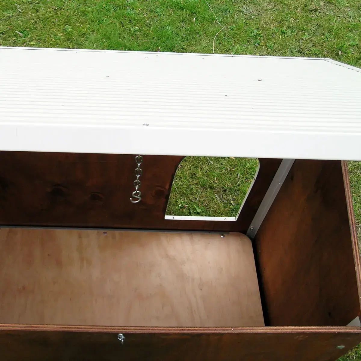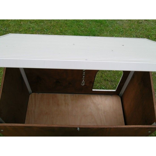 - Gefertigt aus 1,5 cm starken Marinesperrholzplatten, welche mit einem natürlichen Imprägniermittel behandelt wurden um die Hütte vor Witterungseinflüsse zu schützen.