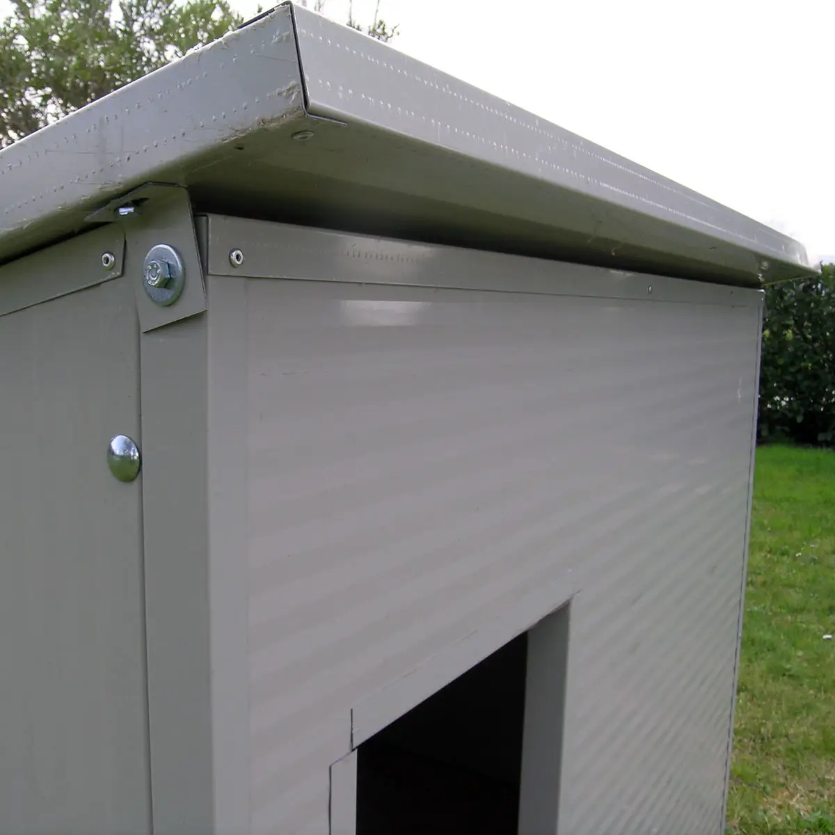 Isolierte, winterfeste Hundehütte aus Isolierplatten mit aufklappbarem Schrägdach, geeignet für große und sehr große Hunde.