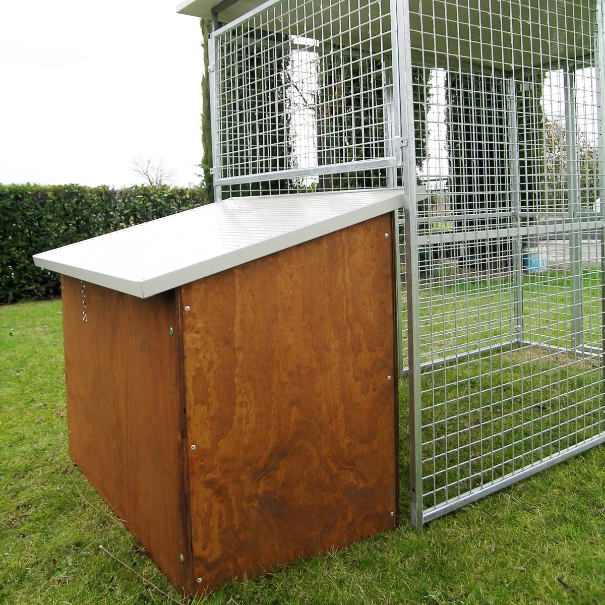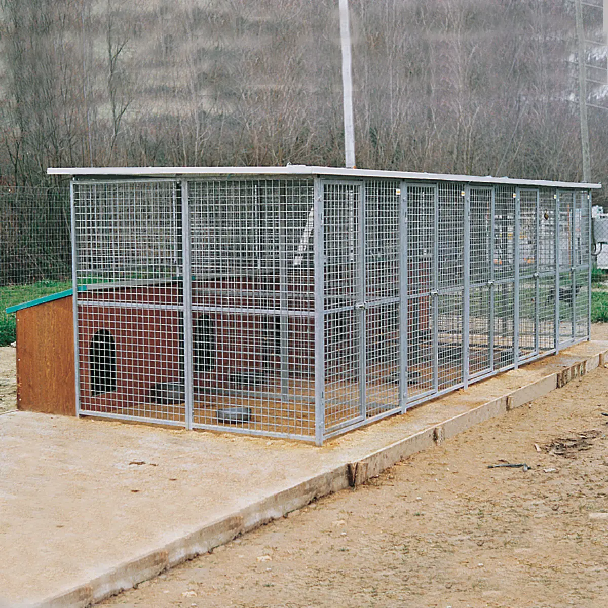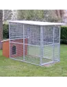 - Das Gehege des Zwingers ist 170 cm hoch und besteht aus feuerverzinkten Gitterpaneelen mit einer Maschenweite von 5 x 5 cm. und hat eine Drahtstärke von 3,9 mm. Das Tor ist bereits mit einem Schlossriegel ausgerüstet. Dieser Bereich kann unkompliziert durch weitere Paneele erweitert werden.