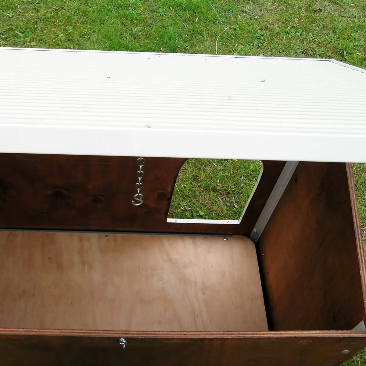 - Der Hundehütte Modell Collie, gefertigt aus 1,5 cm starkem, imprägniertem Marinesperrholz welches leicht zu reinigen und zu desinfizieren ist. Das Dach kann angehoben werden um leicht in das Innere der Hundehütte sehen zu können. Die hölzerne Bodenplatte ist 7 cm. erhöht vom Boden angebracht, abwaschbar und kann zur Reinigung leicht entnommen werden.