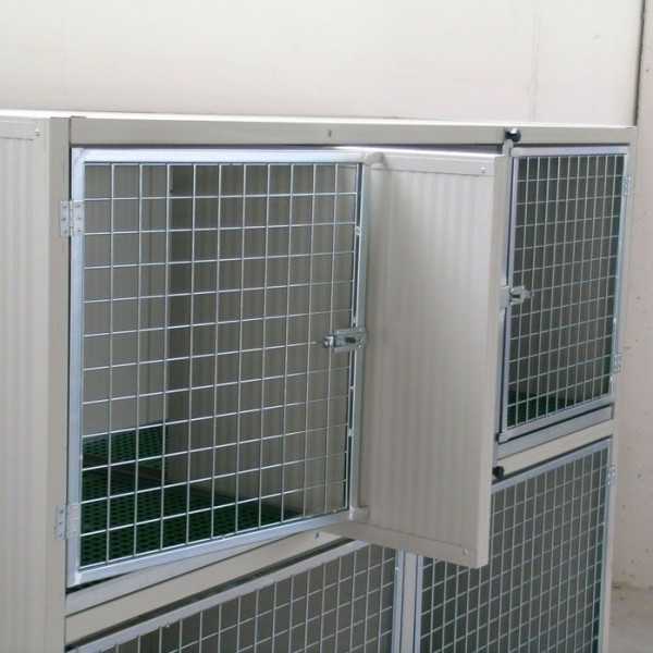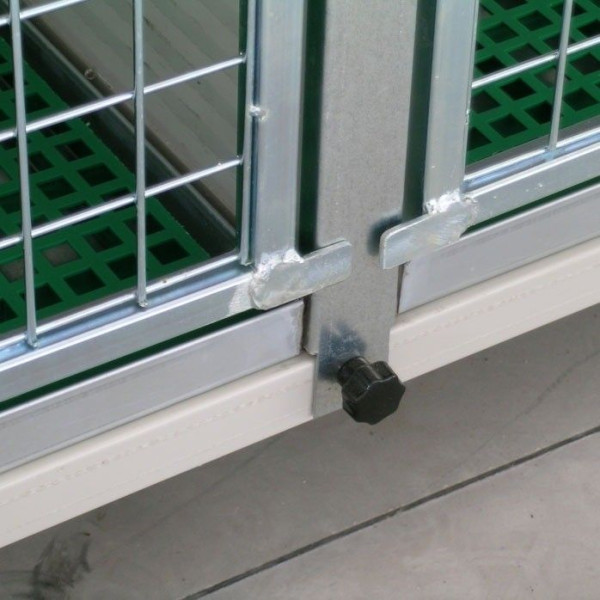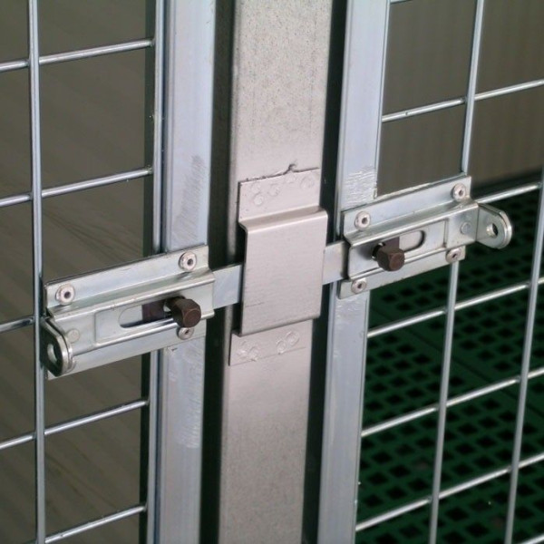 - Die Türen bestehen aus kaltverzinktem Gitterdraht (5,5 cm Maschenweite; 3,9 mm Drahtstärke), montiert mit 2 Scharnieren und einem Schlossriegel, eingefasst in stabilen Metallrohren.
