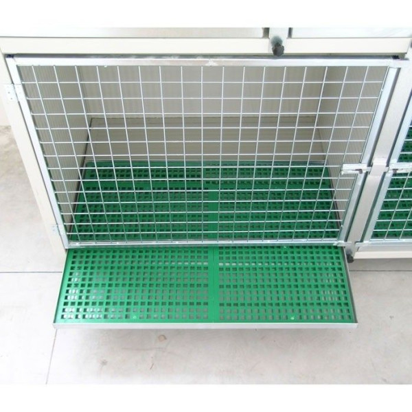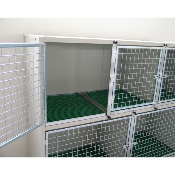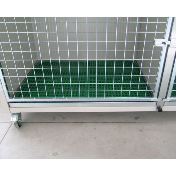 - Der Boden besteht aus einem Kunststoffgitter, die in einen Feuerverzinkten Metallrahmen eingepasst sind. Sie sind leicht herauszuziehen für eine einfache Reinigung und Desinfizierung.