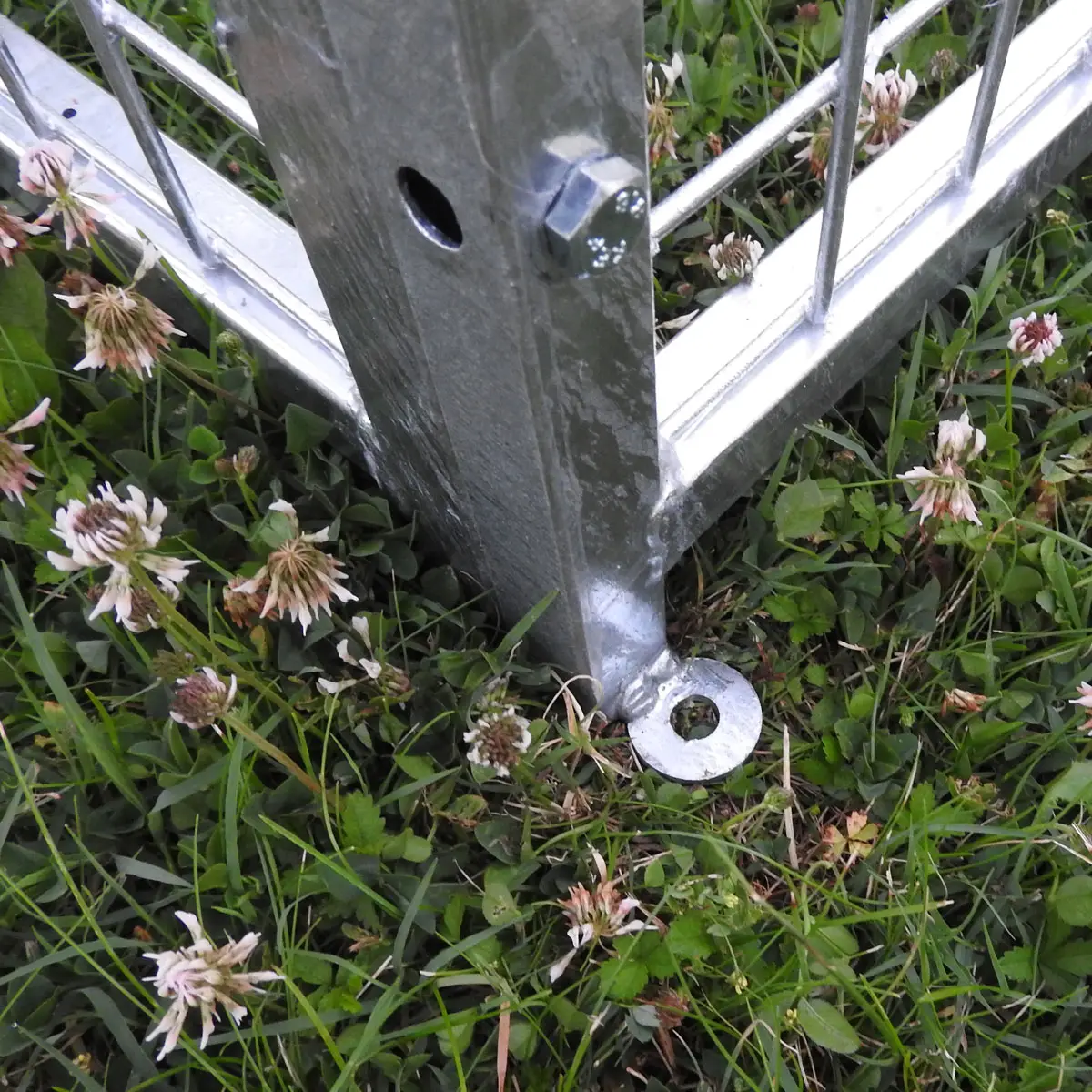 Die einzelnen Gitterpaneele können einfach mit einer Schraube und einer Mutter (8 mm) verbunden werden. Für die Bodenfixierung ist bereits ein Metallring mit einem Durchmesser von 10 mm angebracht. Zur Fixierung sowohl auf Beton als auch auf Gras verwenden Sie bitte 10 mm. Dübel.