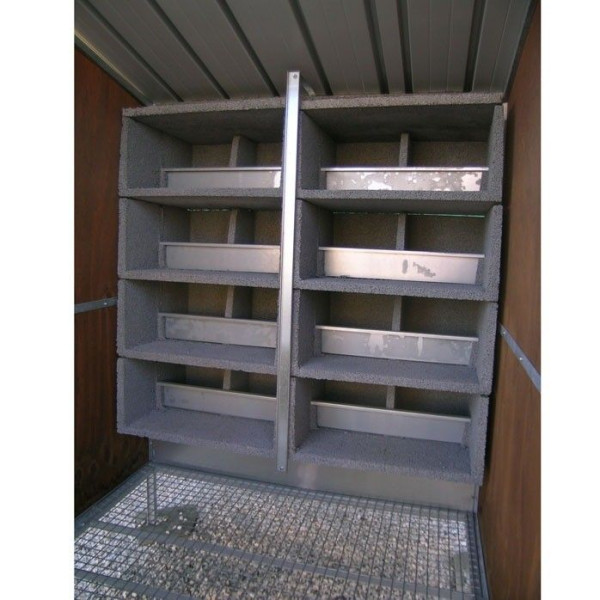 - Konzipiert für den seriellen Aufbau: durch das Aneinanderstellen mehrerer Volieren und dem gleichzeitigen Entfernen der seitlichen Trennwände entstehen Volieren für 20,30,40 oder mehr Taubenpaare.