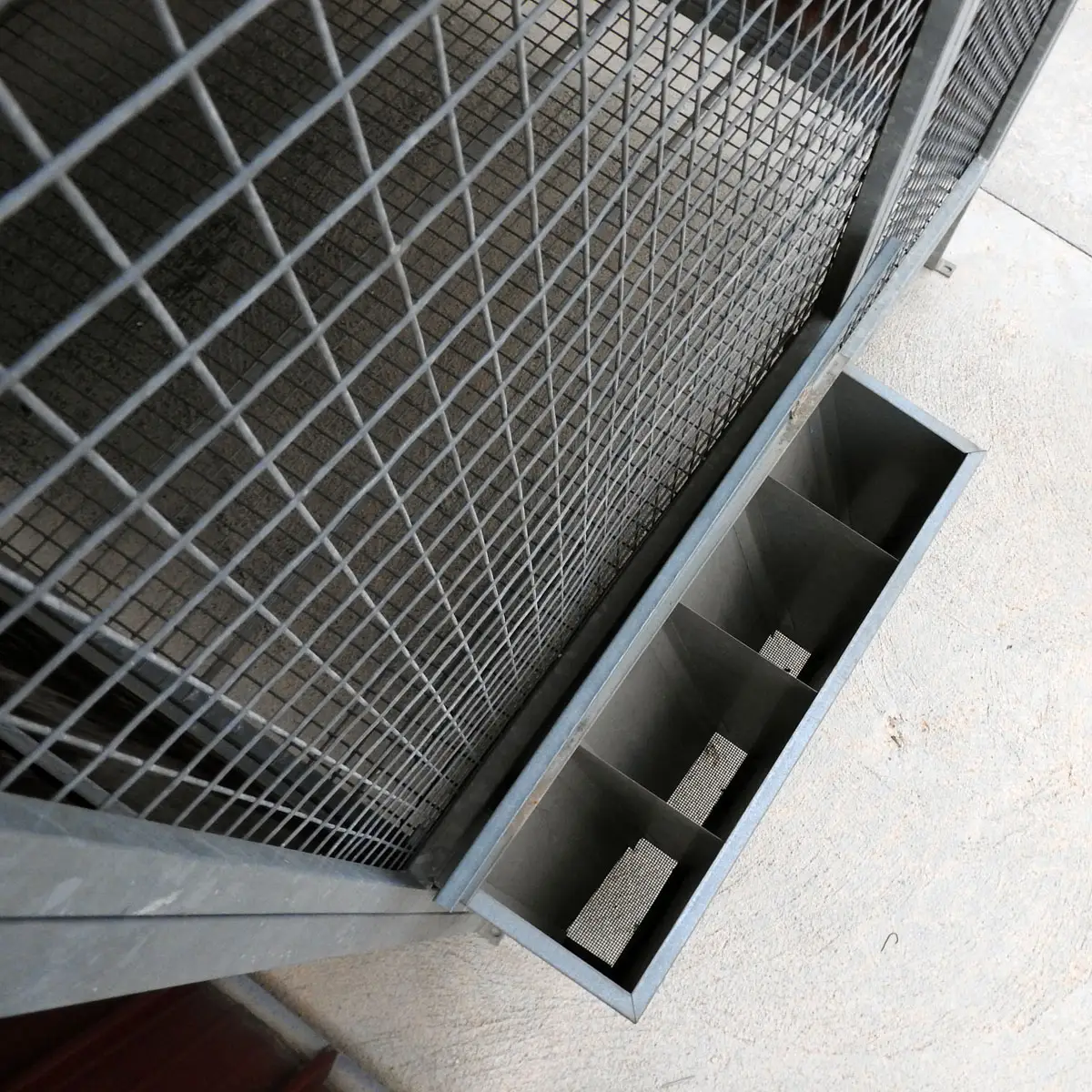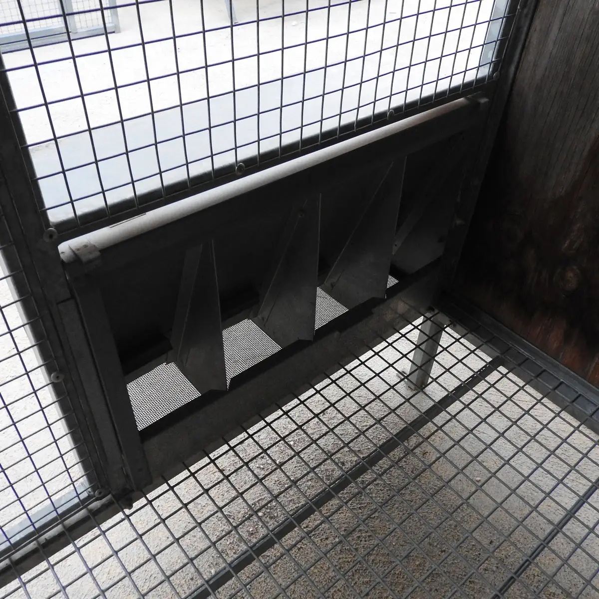 - Der Boden besteht aus einem begehbaren Netz (Maschenweite 3x3 cm) für einen erhöhten Komfort und eine leichte Reinigung.