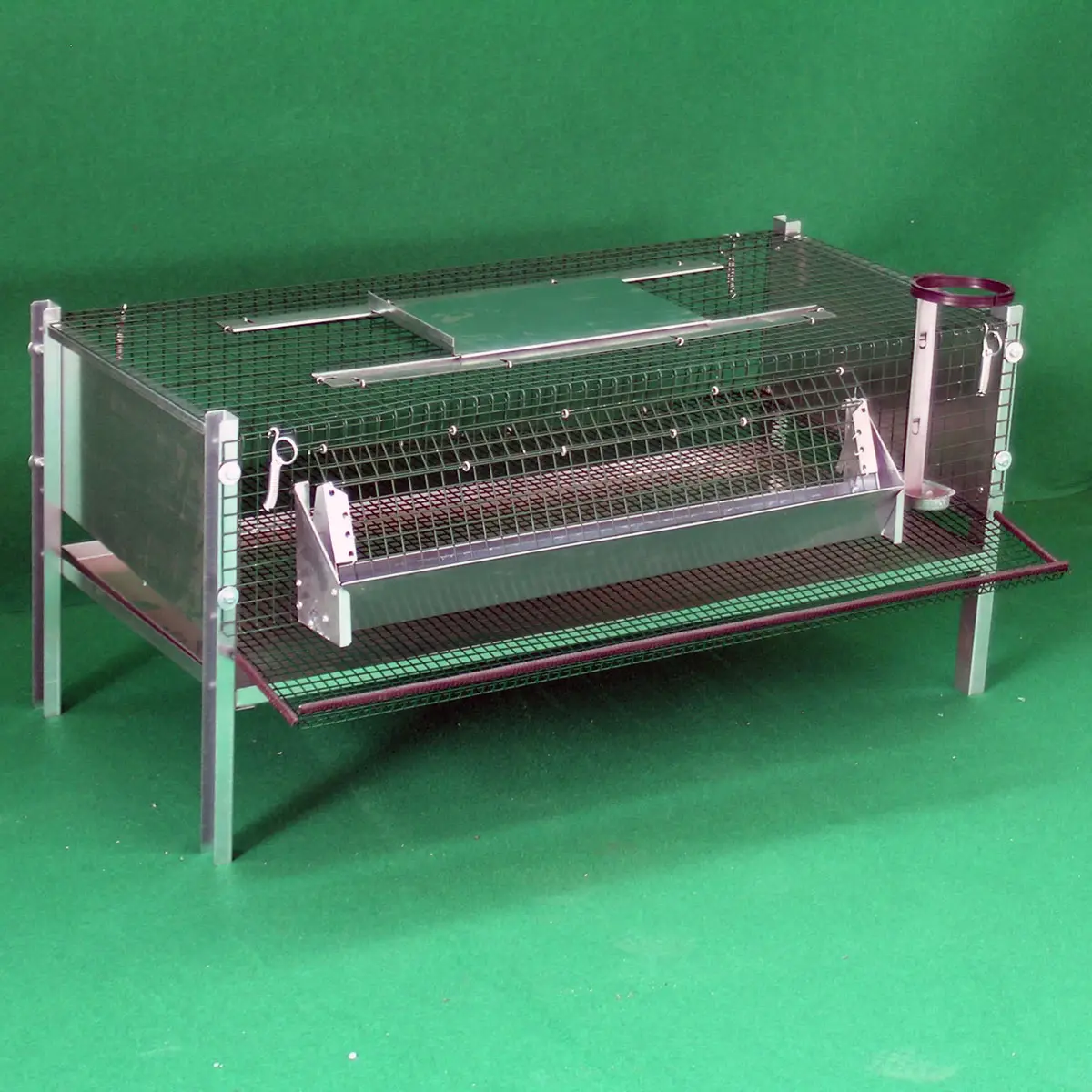 - Komplett ausgestattet mit Futtertrog, Trinkflaschenhalterung, oberer aufschiebbarer Öffnung und herausnehmbaren Kot-Auffangbereich.