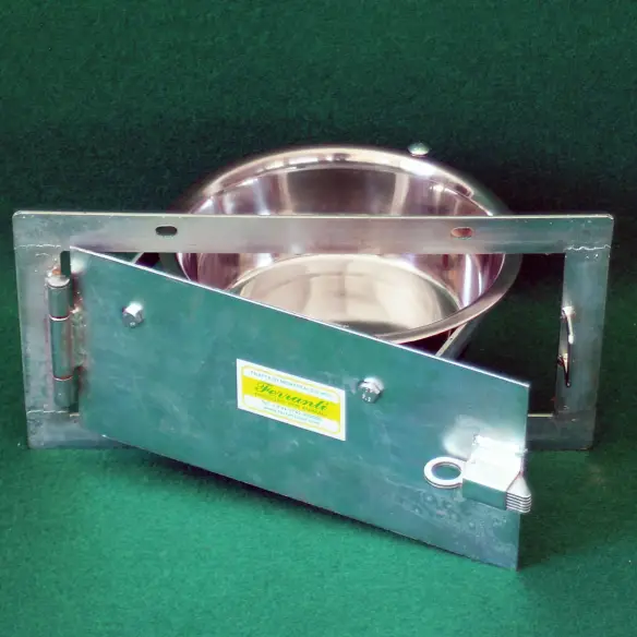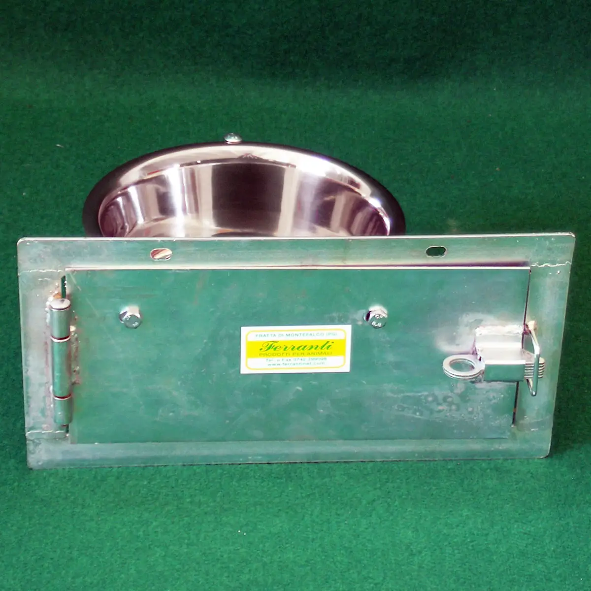 - Klappe kann an das Gitter des Zwingers geschraubt werden und der Fressnapf kann befüllt werden ohne dass der Zwinger betreten werden muss.