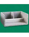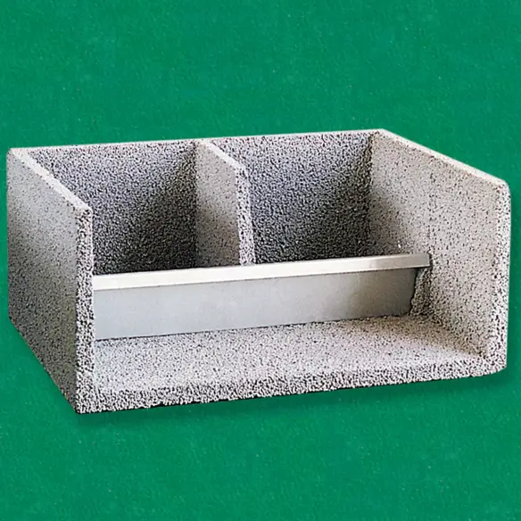 Taubennest aus Ton für ein Taubenpaar. Das vordere Blech ist für eine einfachere Reinigung herausnehmbar. Es besteht aus Blähton und Zement, was es isolierend, leicht desinfizierbar und langlebig macht. Für den Versand per Kurier werden Nester derselben Größe, jedoch aus Holz bestehend verwendet.