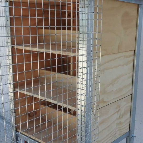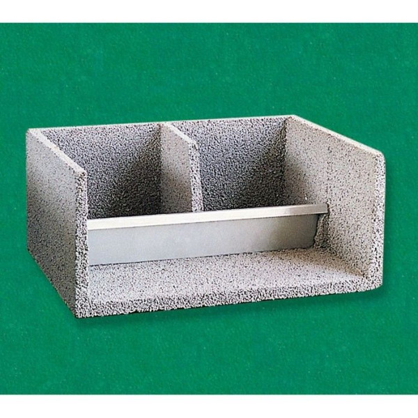 Taubennest aus Ton für ein Taubenpaar. Das vordere Blech ist für eine einfachere Reinigung herausnehmbar. Es besteht aus Blähton und Zement, was es isolierend, leicht desinfizierbar und langlebig macht. Für den Versand per Kurier werden Nester derselben Größe, jedoch aus Holz bestehend verwendet.